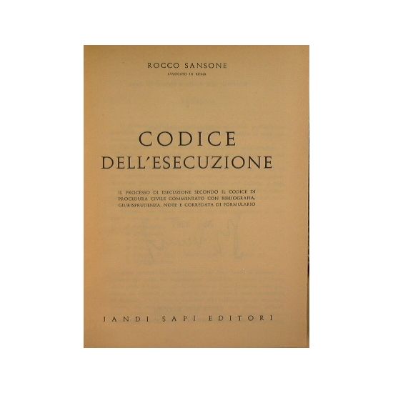 Il processo di esecuzione secondo il codice di procedura civilecommentato con bibliografia, giurisprudenza, note e corredata di formulario - in 16° - pp.XVI + 1131 - Tela con titolo in oro al dorso ed al piatto superiore - I edizione