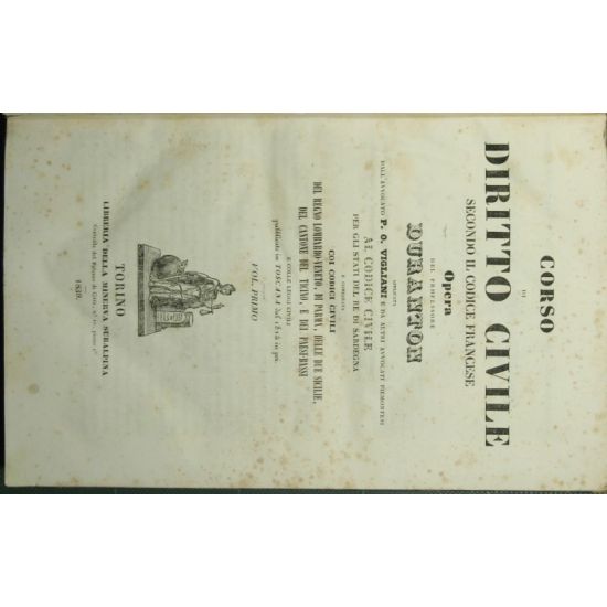 Opera del professore Duranton applicata dall'avvocato P.O. Vigliani e da altri avvocati piemontesi al Codice civile per gli Stati del Re di Sardegna - in 8° - pp.XVI + 587; 639; 549; 730; 848; 551; 715; 616; 700; 621; 680; 847 - Mezza pelle con titolo e fregi in oro al dorso - Dodici volumi - Testo su due colonne. Tagli spruzzati - Fioriture sparse - Comparata coi Codici civili del Regno Lombardo-Veneto, di Parma, delle Due Sicilie, del Cantone del Ticino e dei Paesi Bassi e colle leggi civili pubblicate in Toscana dal 1814 in poi