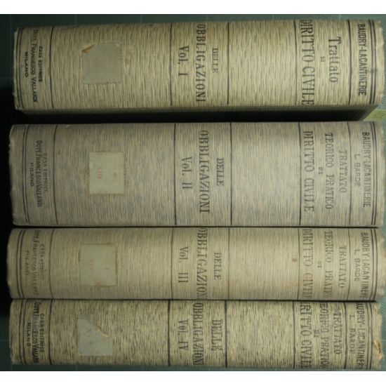 Con appendice di Pietro Bonfante; Con addizione del Prof. Nicola Stolfi - Collana Trattato di diritto civile diretto da G. Baudry-Lacantinerie - in 8° - pp.895; LV + 1190; 874; XLVII + 735 - Tela editoriale - Quattro volumi - Variante del titolo dal II vol.: Trattato teorico-pratico di diritto civile