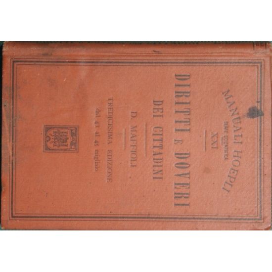 Secondo le istituzioni dello Stato - Per uso delle pubbliche scuole. Tredicesima edizione con un'appendice sul Codice Penale - Collana Manuali Hoepli. Serie scientifica. N. 21 - in 16° - pp.XVI + 229 - Tela editoriale - Dal 41 al 45 migliaio - Timbri al frontespizio e in antiporta