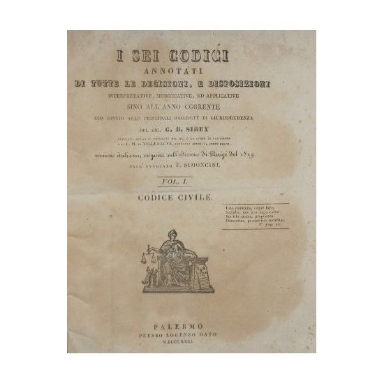 Di tutte le decisioni, e disposizioni interpretative, modificative ed applicative sino all'anno corrente con rinvio alle principali raccolte di giurisprudenza - Versione italiana, eseguita sull'edizione di Parigi del 1829 dall'avv. F. Simoncini - in 8° - pp.560 - Mezza pelle con titolo e fregi in oro al dorso - Testo su due colonne - Piatti danneggiati, tracce di umidità alle prime pagine, forellini in parecchie pagine