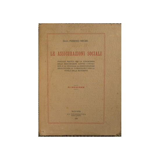 Manuale pratico per la conoscenza delle assicurazioni contro l'invalidità e la vecchiaia, la disoccupazione involontaria, la tubercolosi e per la tutela della maternità - Terza edizione - in 8° - pp.189 - Brossura editoriale - Qualche fascicolo parzialmente slegato. Aloni d'umido all'interno. Pagine lievemente brunite