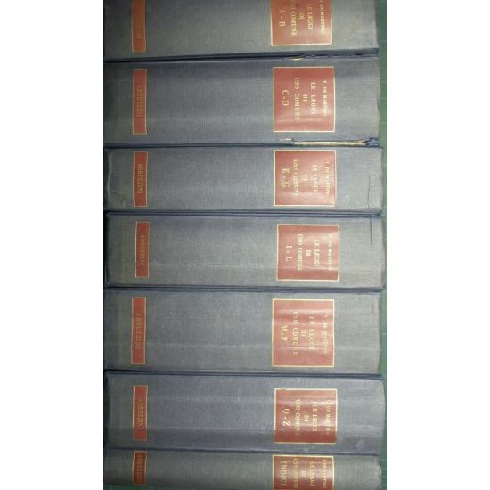 Presentazione di Gaetano Azzariti, Presidente della Corte Costituzionale - in 8° - pp.7992 (numerazione complessiva) - Tela con titolo in oro al dorso ed al piatto superiore - Sette volumi - Testo su due colonne. Prima edizione - Cerniere allentate - Vol. I: A-B; Vol. II: C-D; Vol. III: E-G; Vol. IV: I-L; Vol. V: M-P; Vol. VI: Q-Z; Indice