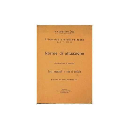 Risoluzione di quesiti - Spese processuali in sede di amnisitia - elenchi di reati amnistiabili - R.Decreto di amnistia ed indulto del 5-11-1932 XI - in 8° - pp.224 - Brossura editoriale - Legatura lenta - Copertina strappata- Rare sottolinature a matita colorata