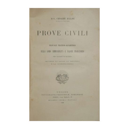 Manuale pratico alfabetico sulla loro ammissibilità e valore probatorio per ragione di materia secondo la legge, la dottrina e la giurisprudenza - in 8° - pp.582 - Mezza pelle con titolo e fregi in oro al dorso - Abrasioni sul dorso, fioriture in qualche pagina