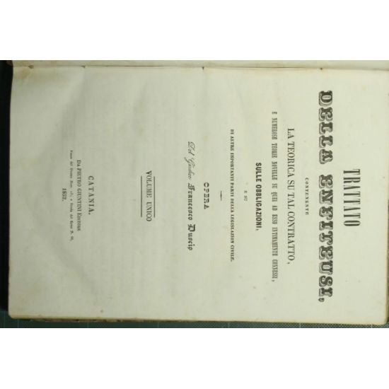 Contenente la teorica su tal contratto, e numerose teorie novelle su quei ad esso intimamente connessi, sulle obbligazioni e su di altre importanti parti della legislazion civile - Opera del Giudice Francesco Duscio. Volume unico - in 8° - pp.XX + 527 - Mezza pelle con titolo e fregi in oro al dorso - Tagli gialli. Testo su due colonne