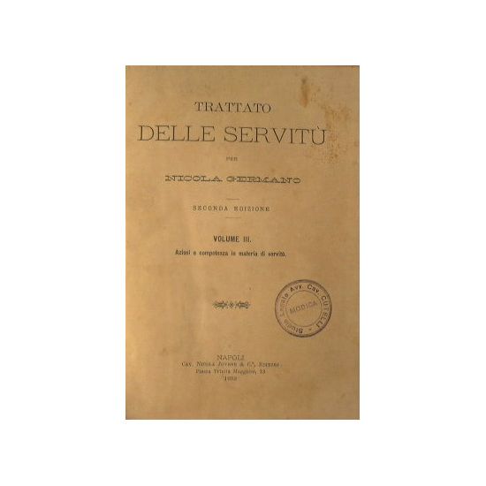 Azioni di competenza in materia di servitù - Seconda edizione - VOL. III - in 8° - pp.554 - Mezza pelle con titolo in oro al dorso - Tracce d'umido al risguardo. Lievi abrasioni alla legatura.Timbro di appartenenza al frontespizio