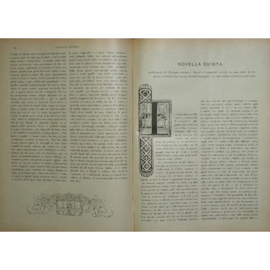 Di messer Giovanni Boccaccio - in 8° - pp.Due pagine nn. + 294; 237 - Tela e carta illustrata ai piatti e al dorso - Due volumi - Illustrazione a colori al piatto superiore, illustrazioni in b/n fuori testo a tutta pagina del pittore F. Moro, testatine, finalini e capilettera riccamente decorati - Testo su due colonne - Piccole mancanze al dorso, firme a matita colorata e a penna ai frontespizi e alle prime pagine