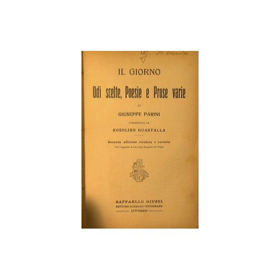 Odi scelte, poesie e prose varie - Commentate da Rosolino Guastalla - in 16° - pp.XX + 253 - Mezza pelle con titolo in oro al dorso - Seconda edizione. In buone condizioni. - Piccole abrasioni alla legatura. Note a penna e amatita ad una pagina. Piccola mancanza ad un angolo e strappetti al margine. - Con l'aggiunte di una larga biografia del Poeta.