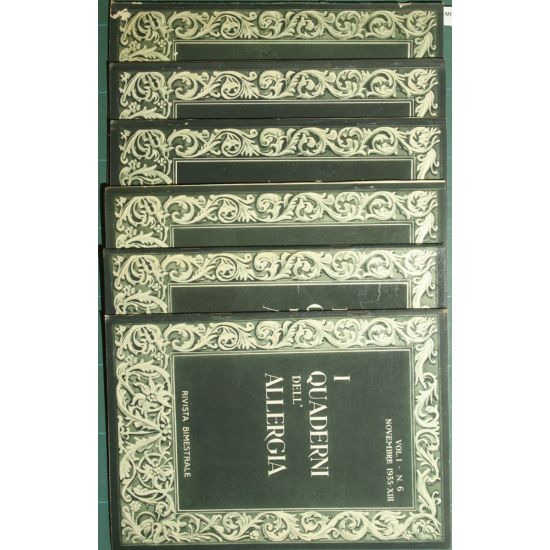 Rivista medica bimestrale - Collana I quaderni dell'allergia. Vol. I - nn. 1/6 - in 8° - pp.200 (numerazione continua) - Brossura editoriale illustrata - Sei fascicoli - Immagini in b/n nel testo e fuori testo - N. 1 - Gennaio; n. 2 - Marzo; n. 3 - Maggio; n. 4 - Luglio; n. 5 - Settembre; n. 6 - Novembre