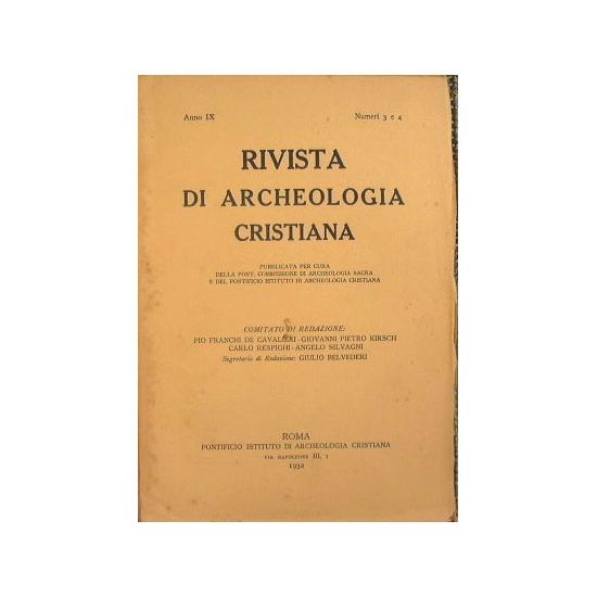 Pubblicata per cura della Pont.Commissione di Archeologia Sacra - In 8° - pp.358 - Brossura editoriale - 2 - Diffuse illustrazioni,anche a piena pagina ed a colori,nel testo. - Presenza di 5 tavole più volte ripiegate fuori testo - Fra gli articoli : Kirsch ''Cubicoli dipinti del Cimitero dei SS.Pietro e Marcellino sulla via Labicana'' - Silvagni ''La topografia cimiteriale della Via Aureliana'' - Josi ''Scoperta di due frammenti del carme Damasiano in onore di S.Ermete'' - Besson '' La Madonna di Tivoli'' - Kirsch '' La Chiesa di S.Agostino in Roma'' - Tozzi '' Il Tesoro di ProJecta'' etc etc