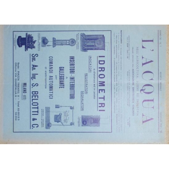 Nell'agricoltura, igiene ed industria - Rivista mensile. Organo ufficiale dell'Associazione idrotecnica italiana. Direttore Giovanni Bellincioni - Collana L'acqua. Anno XI - nn. 1-12 (Gennaio/Dicembre 1933) - in 4° - pp.228 (numerazione continua) - Brossura editoriale illustrata - Undici fascicoli - Immagini in b/n nel testo - Testo su due colonne