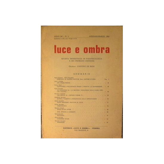 in 4° - pp.107 - Cartonata editoriale - Ottima conservazione - Anno 84° n.1 Gennaio-Marzo 1984.Rivista trimestrale di parapsicologia e dei problemi connessi. Fra gli argomenti: '' Guarigione e psicoterapia presso i primitivi: lo sciamanismo. Prime esperienze ipnotiche in Italia. Scienza,filosofia e problematica della sopravvivenza.''