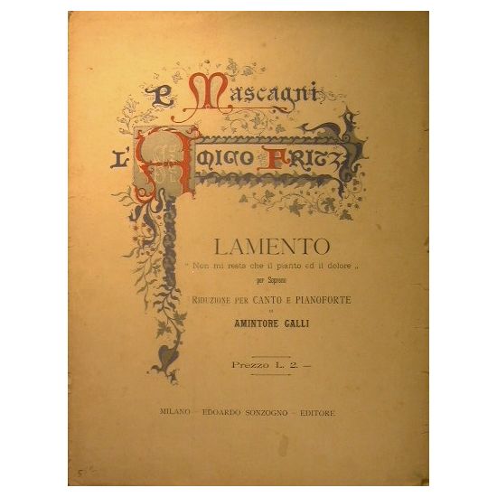 Lamento - Non mi resta che il pianto ed il dolore - Riduzione di Amintore Galli - in 4° - pp.9 - Brossura editoriale illustrata - Partitura per Voce Soprano e Pianoforte