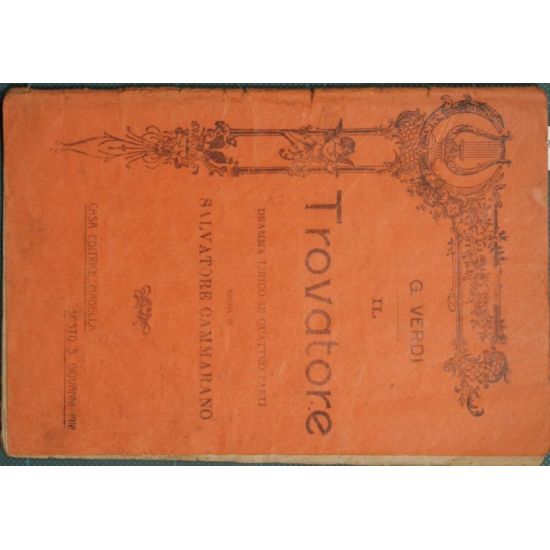 Dramma in quattro parti - Poesia di Salvatore Cammarano. Musica di Giuseppe Verdi - in 16° - pp.32 - Brossura editoriale illustrata - Dedica a penna al frontespizio