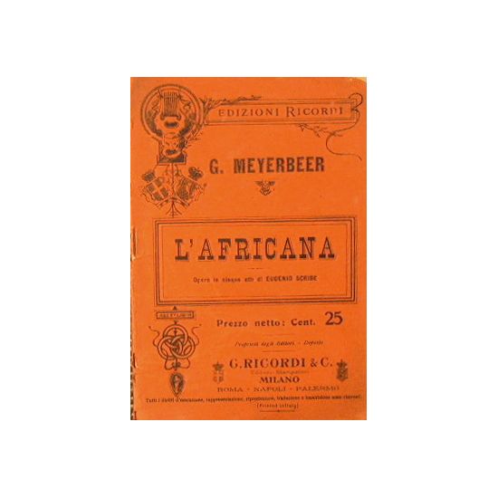 Opera in cinque atti di Eugenio Scribe. Traduzione italiana di M. Marcello. Musica di Giacomo Meyerbeer. - in 16° - pp.54 - Brossura editoriale - Piccole abrasioni al dorso - Brossura sciupata