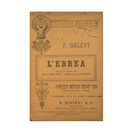Opera in cinque atti. Poesia di Eugenio Scribe - in 16° - pp.47 - Brossura editoriale - Strappo al piatto superiore rispetto al dorso senza mancanze. Note al piatto superiore. Firma di appartenenza al frontespizio. Pagine brunite
