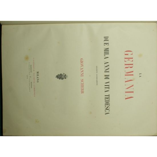 Due mila anni di vita tedesca - Descritti istoricamente da Giovanni Scherr - in 4° - pp.X + 176; 179-401 - Mezza pelle con titolo e fregi in oro al dorso - Due volumi - Controfrontespizio illustrato in b/n, tavole in b/n protette da veline, illustrazioni in b/n nel testo, testatine, finalini e capilettere - Prima edizione. Tagli colorati - Piccola mancanza alla cuffia del I vol., una tavola staccata al II vol., una velina mancate,diffuse bruniture e fioriture alle prime pagine - Quattro tavole a colori ad apertura di ogni parte in cui è suddivisa l'opera (La Germania antica. Il Medio Evo. Il tempo della Riforma. L'età moderna)